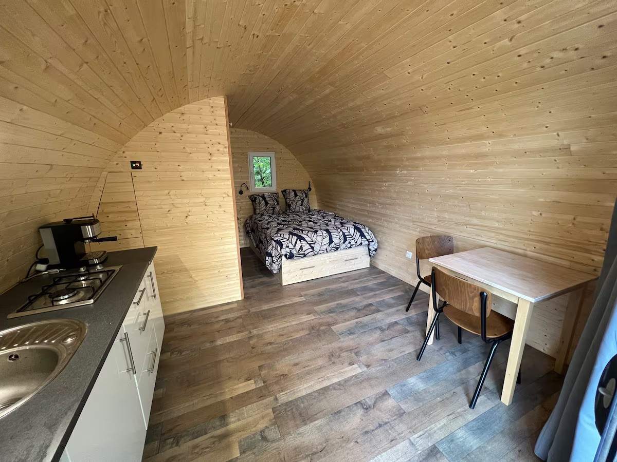 Conçue en bois et ouverte sur la nature, cette cabane allie confort moderne et expérience immersive en pleine forêt.